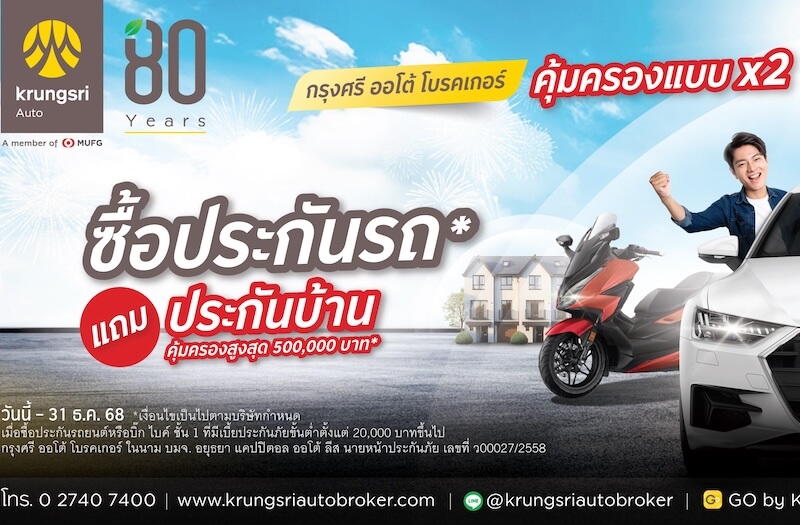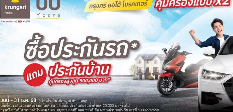 ‘กรุงศรี ออโต้ โบรคเกอร์’ นายหน้าประกันภัย ภายใต้บริษัทอยุธยา แคปปิตอล ออโต้ ลีส จำกัด (มหาชน) ในเครือธนาคารกรุงศรีอยุธยา จำกัด (มหาชน) ต้อนรับช่วงเทศกาลส่งท้ายปีเก่าต้อนรับปีใหม่ มอบความคุ้มครองแบบ “คูณสอง” ให้กับลูกค้าคนพิเศษ ผ่านโปรโมชันสุดคุ้ม “ซื้อประกันรถ แถมฟรีประกันบ้าน” เพื่อให้ผู้ใช้รถหมดกังวลเมื่อต้องเดินทางไกลในช่วงเทศกาล ระหว่างวันที่ 1 ตุลาคม ถึง 31 ธันวาคม 2568