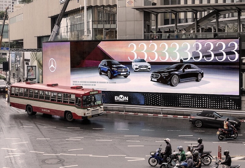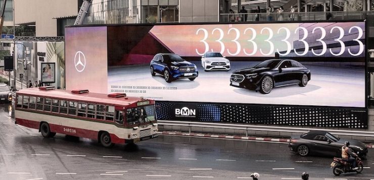 ในช่วงสัปดาห์ที่ผ่านมา คนไทยหลายคนอาจเห็นตัวเลข “333”ที่ปรากฏอยู่บนโซเชียลมีเดีย และสื่อนอกบ้านแบบ Digital Out of Home (DOOH) ที่กระจายอยู่ตามพื้นที่ใจกลางกรุงเทพมหานคร ซึ่งมาในรูปแบบของโฆษณาที่เนื้อหาทั้งหมดขึ้นเป็นเลข 3333333333 ไม่ว่าจะเป็นในส่วนของหัวข้อและรายละเอียดต่างๆ จนอาจเกิดข้อสงสัยมากมายว่าเลข 3 ที่ว่านี้ สื่อถึงอะไร แต่ชิ้นงานโฆษณาดังกล่าวก็ยังมีจุดสังเกตที่พอให้ผู้คนเดาออกว่าสิ่งนี้ต้องเกี่ยวข้องกับแบรนด์เมอร์เซเดส–เบนซ์ คือภาพของรถยนต์เมอร์เซเดส–เบนซ์ จำนวน 3 รุ่น